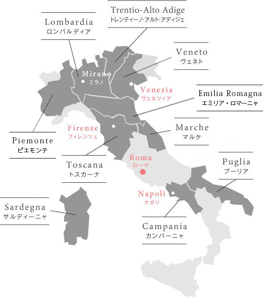 その独自の食文化は、各地に広がるワイン産地とも密接に関係しているという特徴がイタリアにはあります。それぞれの土地の土壌・風土によって育まれたワインは、その地域の料理にマッチするようなキャラクターを持ち合わせています。日本人にとって最も好まれる西洋料理と言えるイタリア料理にぴったりの個性豊かな優れた品質のワインです。